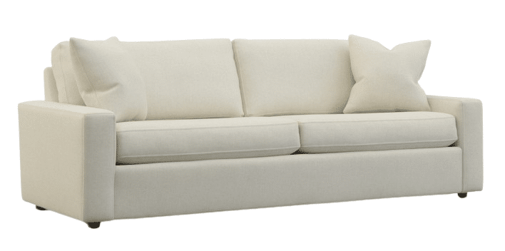 Measures 87"W x 41"D x 37"H and is available in a variety of fabrics, leathers, and leg finishes as well as cushion options. Also available as a loveseat, chair, and sectional configurations. Starting at $2.749 in fabric and $3,889 in leather.